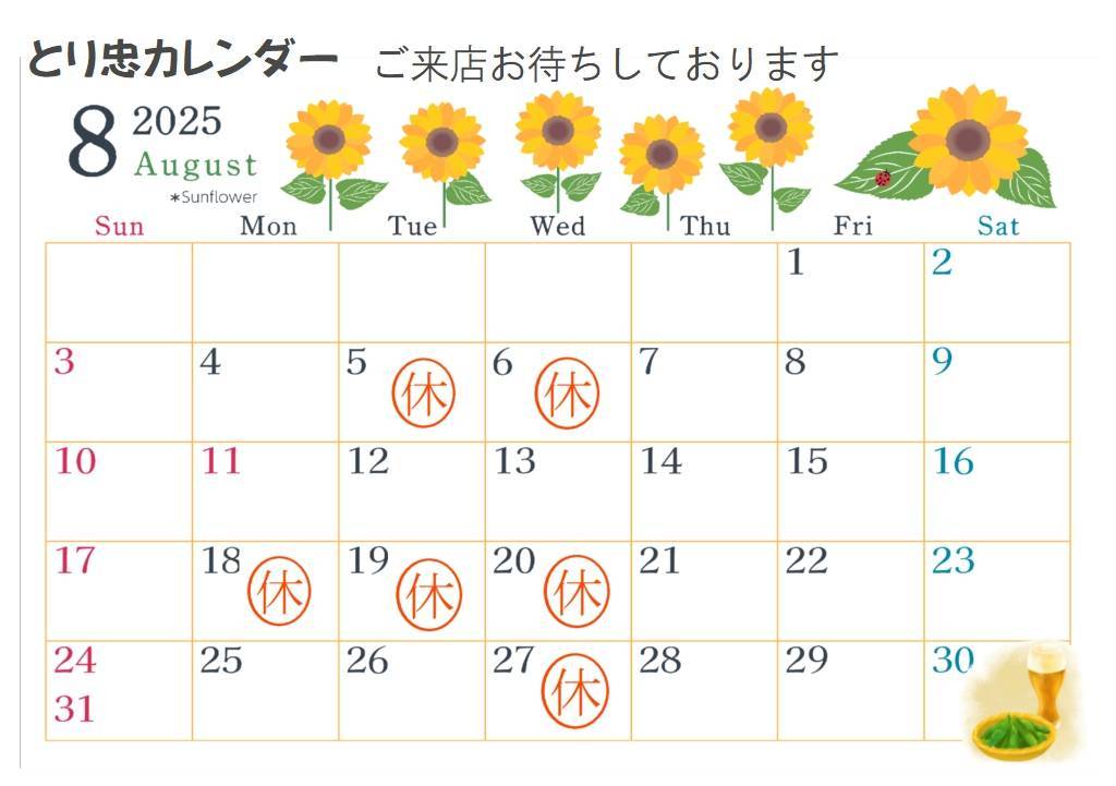 8月の営業とお休みのお知らせ